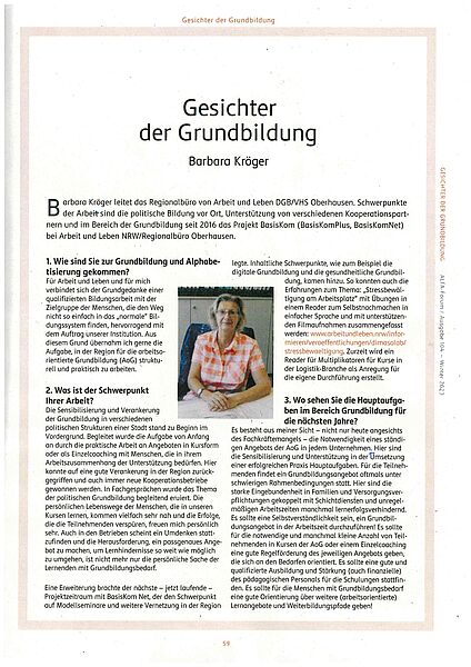 Barbara Kröger leitet das Regionalbüro von Arbeit und Leben DGB/VHS Oberhausen; Schwerpunkte der Arbeit sind die politische Bildung vor Ort, Unterstützung von verschiedenen Kooperationspartnern und im Bereich der Grundbildung seit 2016 das Projekt BasisKom (BasisKomPlus, BasisKomNet) bei Arbeit und Leben NRW/Regionalbüro Oberhausen. Die mehr als siebenjährigen Erfahrungen in der arbeitsorientierten Grundbildung zeigen, dass die regionalen Schwerpunkte von Arbeit und Leben gut mit einem Angebot für Menschen mit Grundbildungsbedarf verbunden und das Thema über die Projekte in der Region verankert werden konnte.