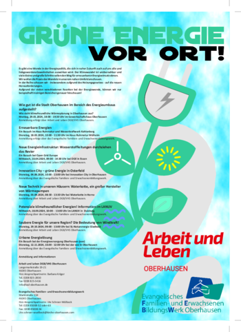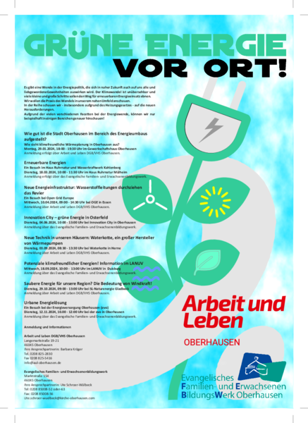 Die aktuelle Reihe "Grüne Energie vor Ort" wird in Kooperation von Arbeit und Leben DGB/VHS Oberhausen mit dem Evangelischen Familien- und Erwachsenenbildungswerk organisiert. Die geplanten acht Angebote reichen von dem Stand der Wärmeplanung bis hin zur Windkraft. Wir freuen uns über Ihre Anmeldung!