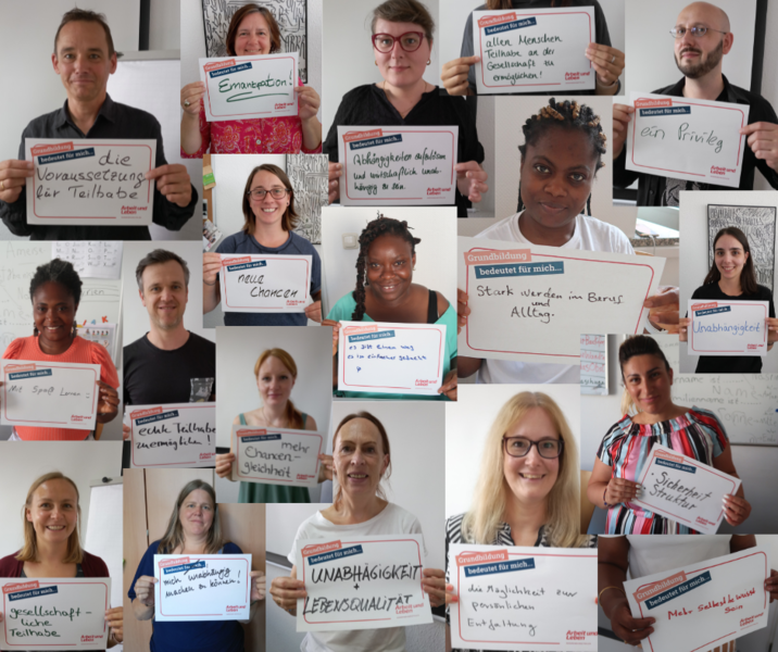 Unser Projekt "BasisKomNet" organisiert Grundbildung für Beschäftigte in Betrieben in der Region. Was die Grundbildung den Menschen bedeutet, ist hier durch Betroffene und Multiplikatoren plakativ anlässlich des Weltalphabetisierungstages dargestellt!